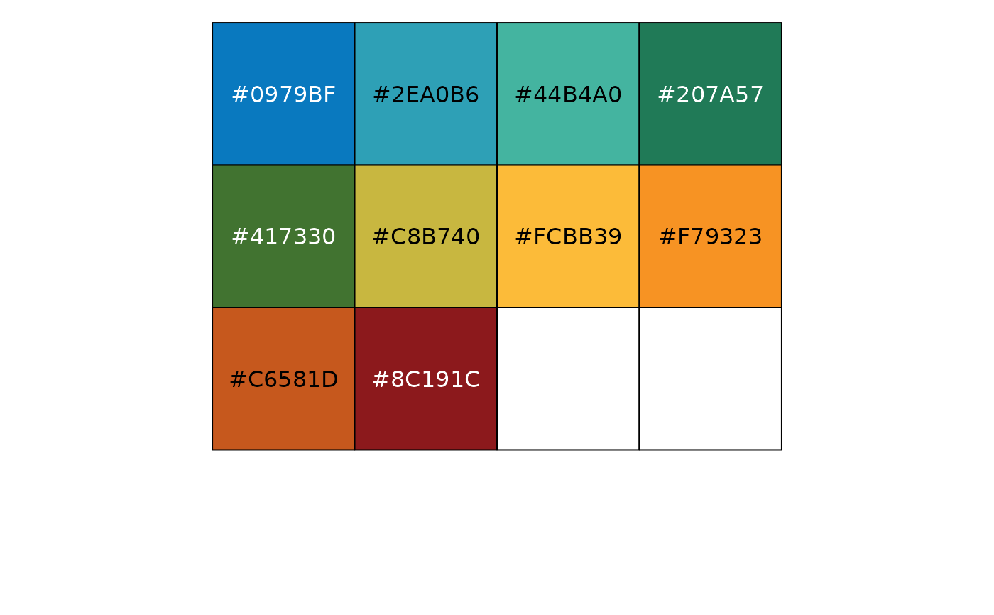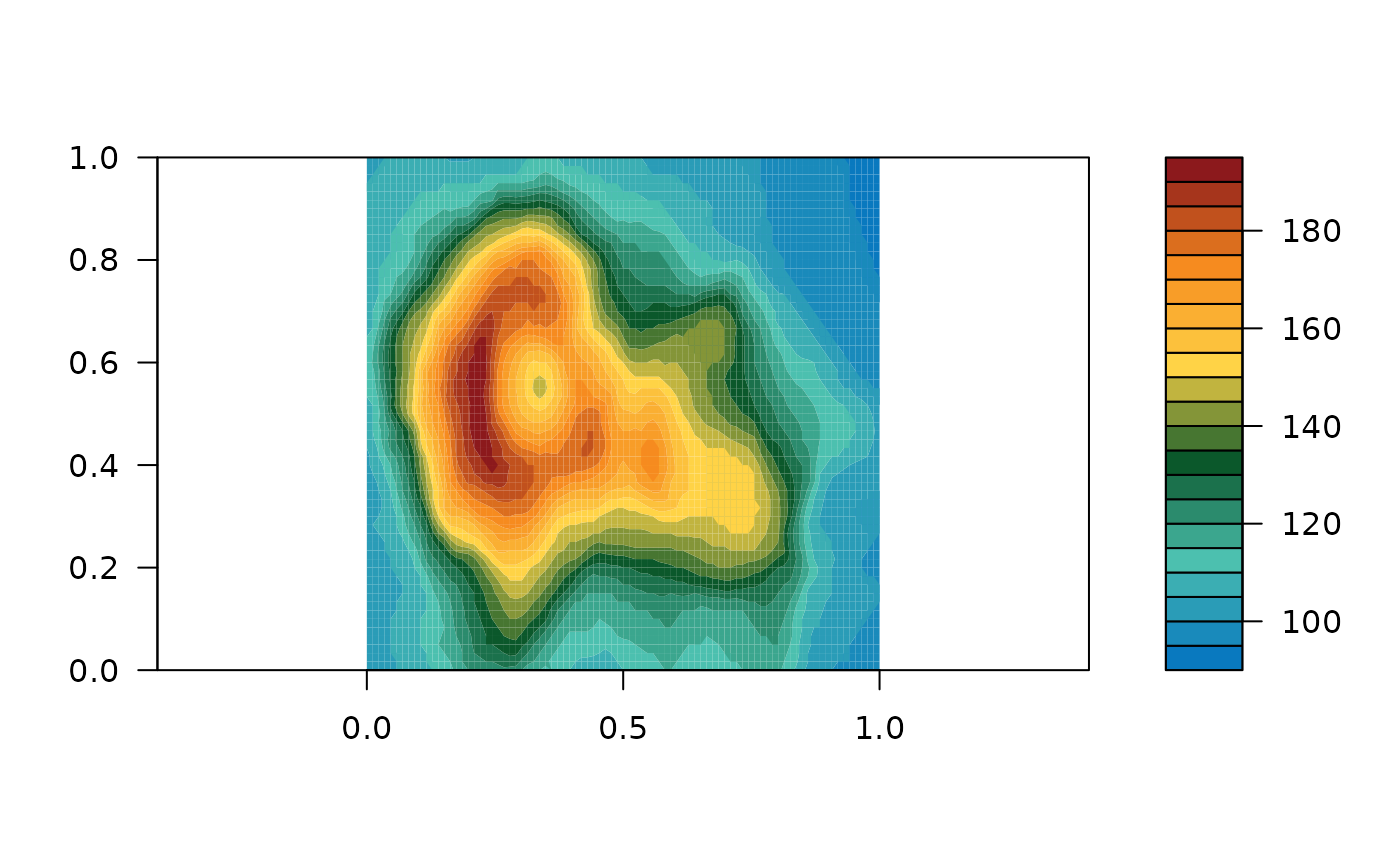 filled.contour(volcano,color.palette = camp_rio_palette_ramp(), asp=1)